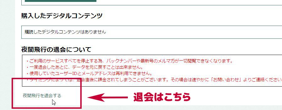 解約は夜間飛行のホームページにログイン後、マイページからできます。